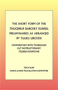 The Barchay Kunsel is a particularly large anthology and has several texts for doing the preliminary practices: long, middling, and short length forms. The late Tulku Ugyen, father of the current Tsikay Chogling Rinpoche was asked by his Western students to make an exceptionally short version of the already short version so that they could manage to do it in their busy Western lives. Tulku Ugyen accomodated their requests by writing a super-condensed version of the short length text. There was no official commentary on this super-condensed version until one day some students of Tsoknyi Rinpoche came and asked for an explanation of how to do it. At that time, Tsoknyi Rinpoche asked Tony to translate his explanation and additionally to produce a handbook for people wanting to practice it. Tsoknyi Rinpoche mentioned that his commentary was applicable to all versions of the Barchey Kunsel preliminaries, regardless of length.